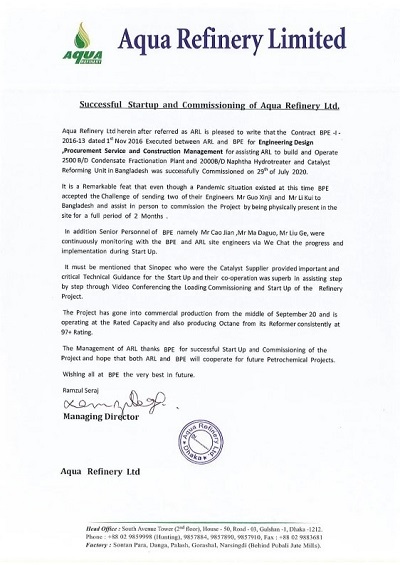 近日,由北京石油化工工程有限公司負(fù)責(zé)設(shè)計及部分采購工作的孟加拉項目(2500B/D凝析油蒸餾裝置和1500B/D半再生重整裝置)業(yè)主AQUA Refinery公司發(fā)來感謝信,對我公司在項目設(shè)計、建設(shè)方面做出的努力給予了高度肯定和贊揚,并對在孟加拉國新冠疫情爆發(fā)時期,為配合項目試車工作我公司派出的兩位專家表示感謝。