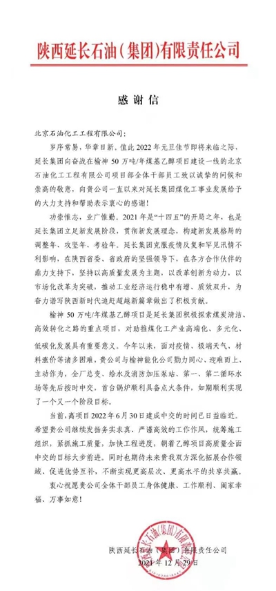 在北京石油化工工程有限公司總承包的延長石油榆神能化50萬噸/年煤基乙醇項目緊鑼密鼓、加快建設的關鍵時期,12月29日,陜西延長石油(集團)有限責任公司向我公司發來感謝信,對我公司2021年乙醇項目建設工作給予了充分肯定和高度評價。