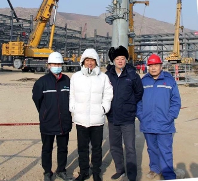 內蒙古東源科技有限公司董事長俞海明、東景生物環?萍加邢薰究偨浝眈R民峰,北油工程公司副總經理劉戈等相關領導共同見證了該項目最高設備的吊裝順利完成。
