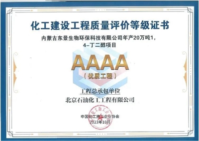 近日,中國化工施工企業協會公布2023年化工建設工程質量評價結果,北京石油化工工程有限公司總承包的“內蒙古東景生物環?萍加邢薰灸戤a20萬噸1,4丁二醇(BDO)項目”榮獲化工建設工程質量評價4A級(優質工程)。