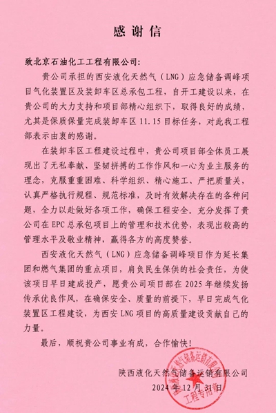 近日,北京石油化工工程有限公司收到來自陜西液化天然氣儲備運銷有限公司的感謝信,對我公司在西安液化天然氣(LNG)應急儲備調峰項目(簡稱:西安LNG項目)11.15項目節點建設期間全體參建人員不分晝夜,不斷投入機械和人力,以“向白晝爭分秒,向黑夜要時間”的拼勁,保質保量完成裝卸車區工程目標表示感謝。