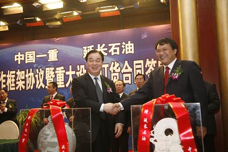儀式上,中國一重高級副總裁蔡連重與延長石油集團副總經理馮和平簽署了戰略合作框架協議,中國一重副總裁李瑜與北京石油化工工程公司總經理劉純權簽訂了重大設備訂貨項目合同。